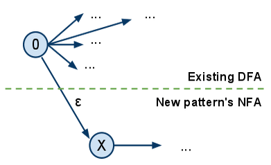 where 0 is the start node of the existing DFA and X is the start node of the new pattern to be added.